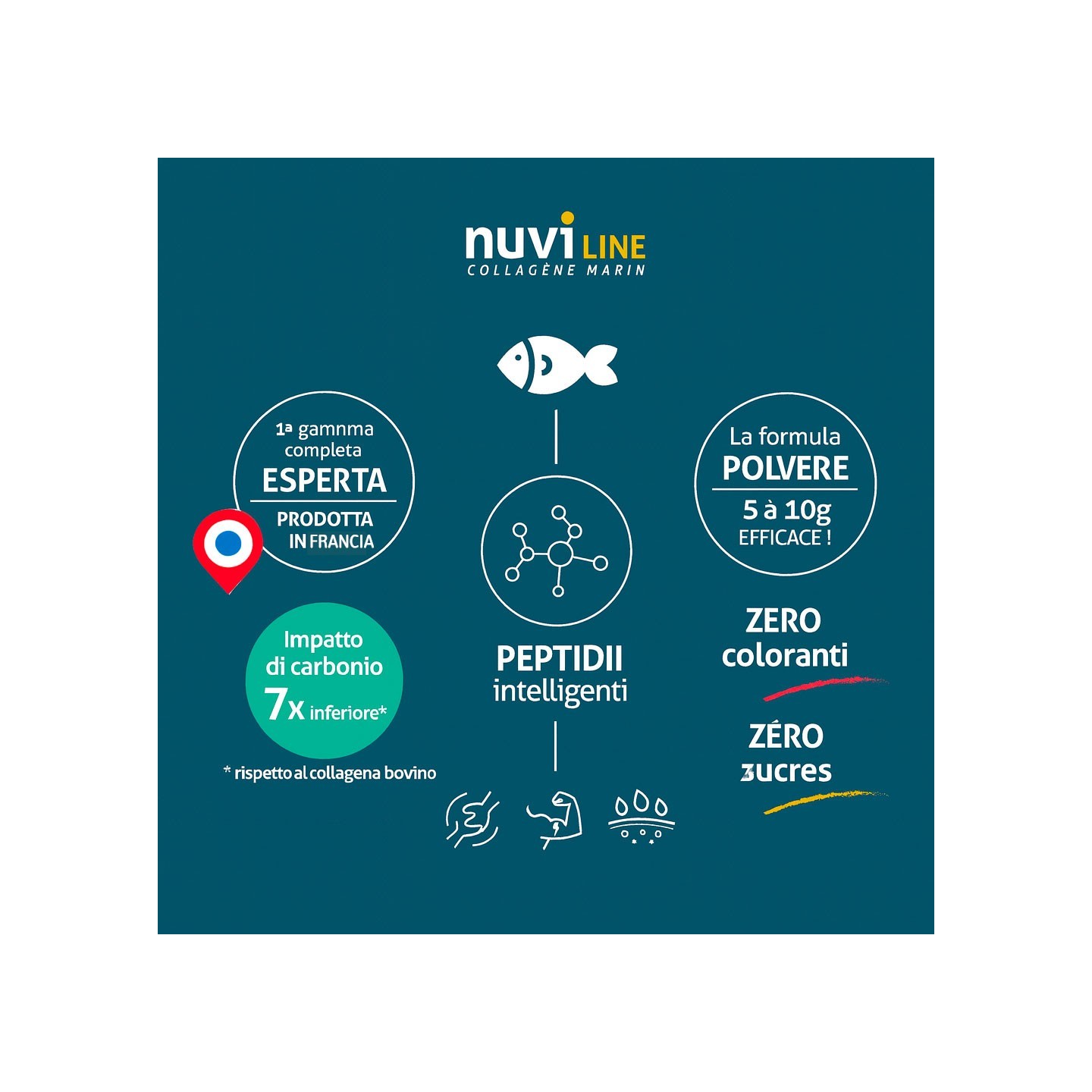 - È composto da proteine sotto forma di un profilo peptidico bioattivo unico (idrolisi enzimatica) di collagene marino naturale derivato da un approccio di sviluppo sostenibile (ASC Aquaculture Stewardship Council, BAP Best Aquaculture Practice e MSC sustainable fishing labels).